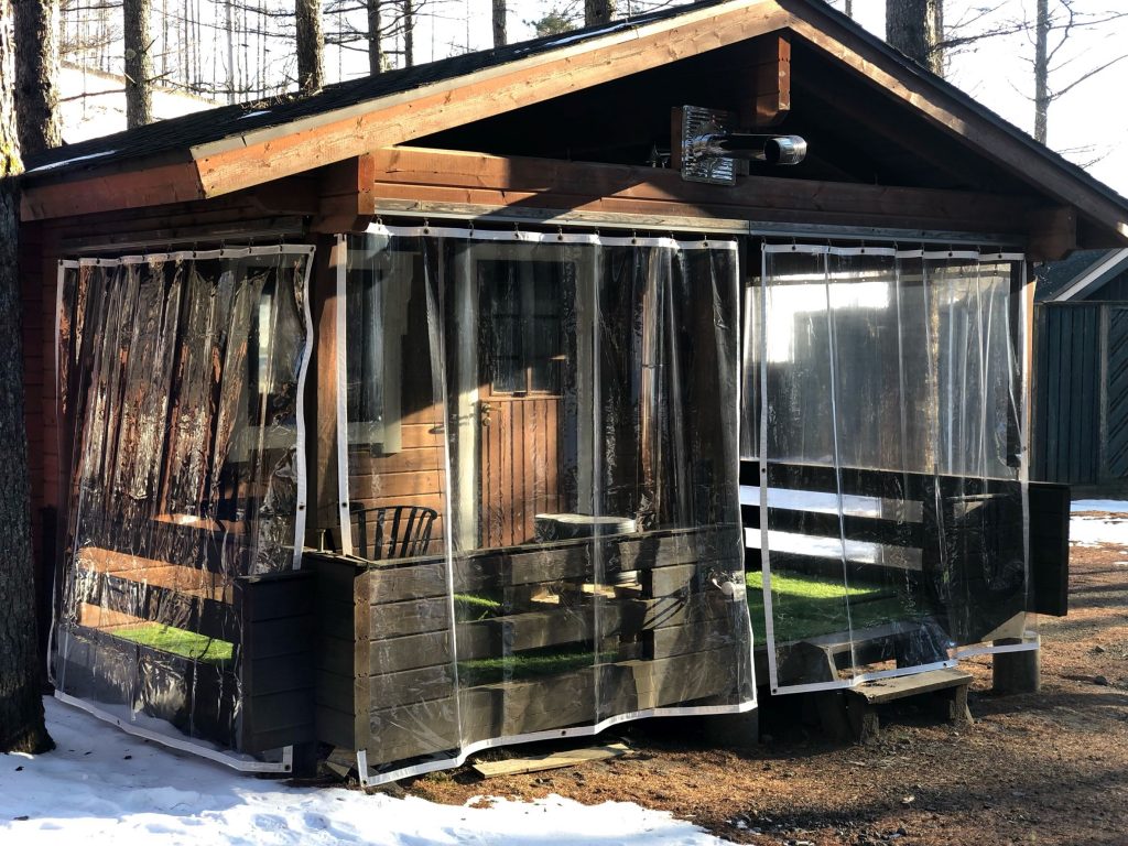 冬の利用をもっと気軽に楽しんでもらうためにデラックスコテージG棟の2棟、デラックスコテージL棟の内1棟、デラックスコテージK棟に防風カーテン・薪ストーブを設置し、無料で利用できます。(薪は別売り)