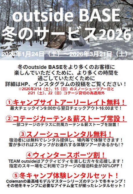 去年好評だったキャンプサイトアーリーレイト無料やウィンタースポーツ割、冬キャンプ場体験レンタルを実施します。